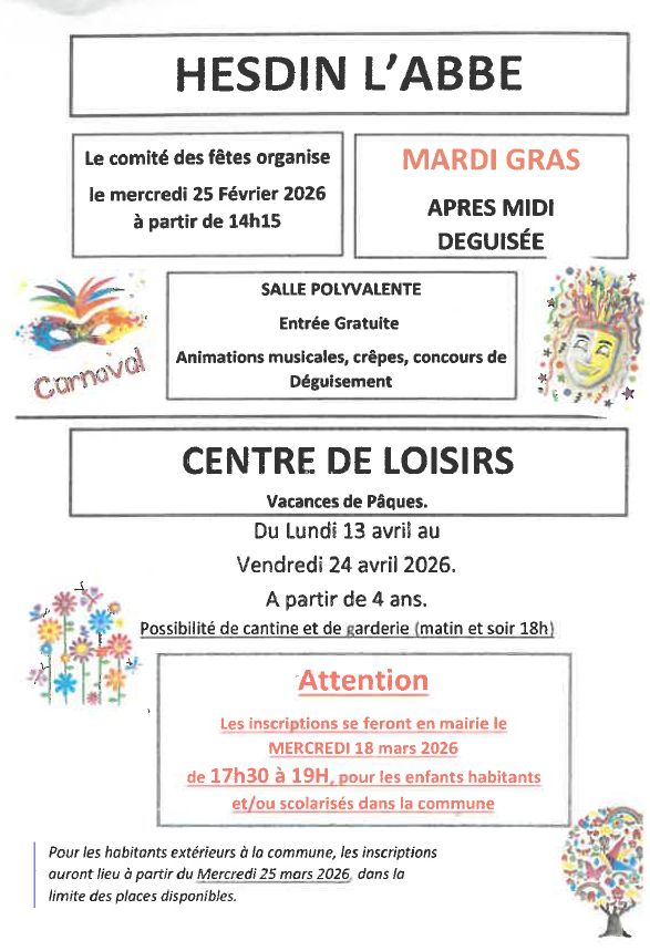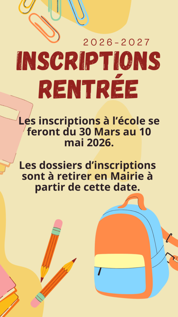 Les inscriptions au Centre de Loisirs pour les vacances d’hiver 2026 auront lieu le mercredi 14 janvier 2026 de 17h30 à 19h00 en Mairie.